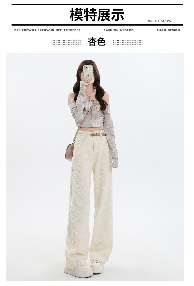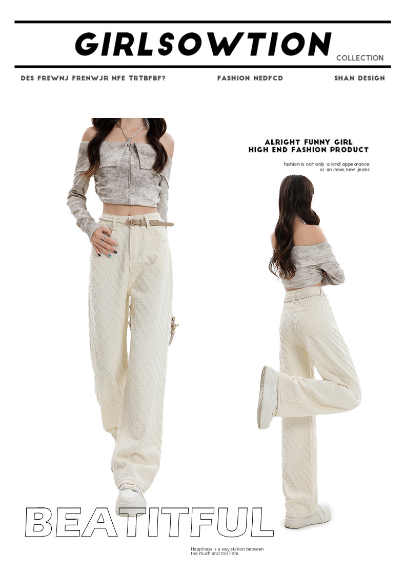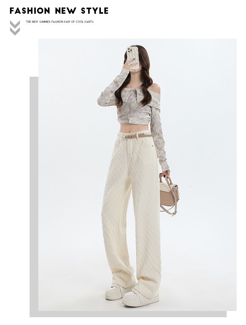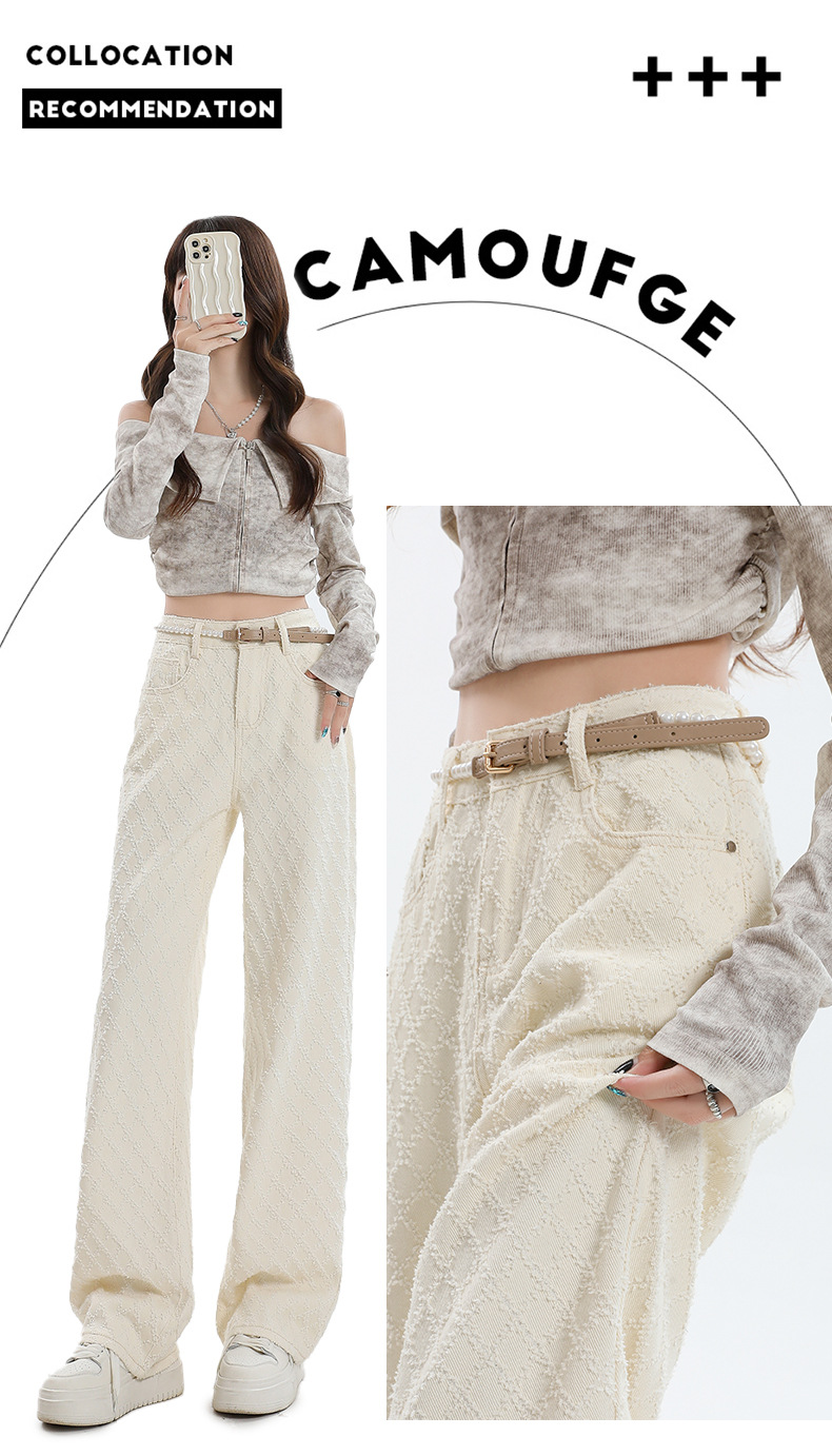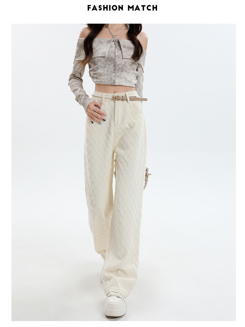 Weiße Hose mit hoher Taille und weitem Bein für Frauen 2024 Winter neuer Stil lose Jacquard stoff Denim Hose mit geradem Bein